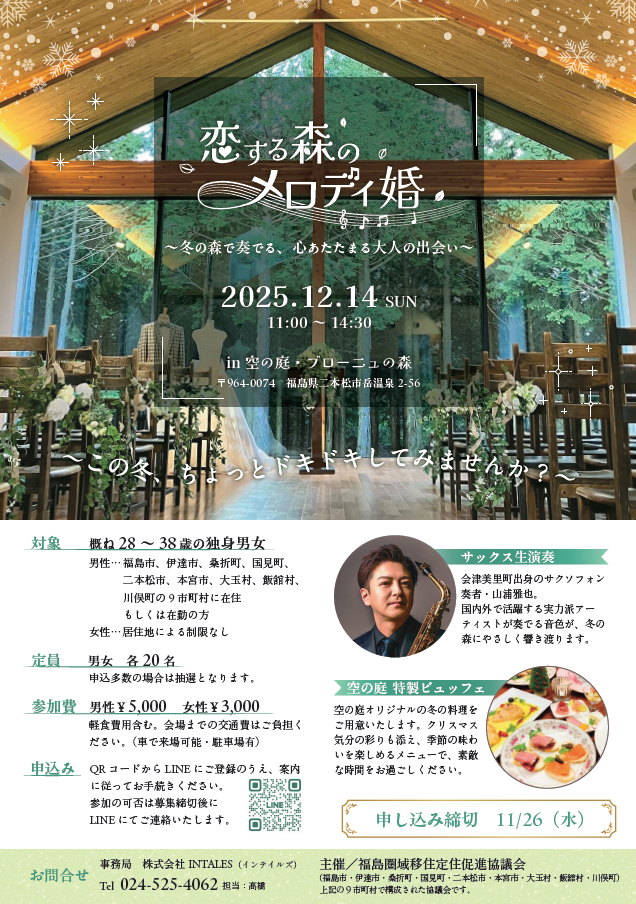 福島圏域移住定住促進協議会が主催する婚活イベント「恋する森のメロディ婚」~冬の森で奏でる、心あたたまる大人の出会い~が開催されます。