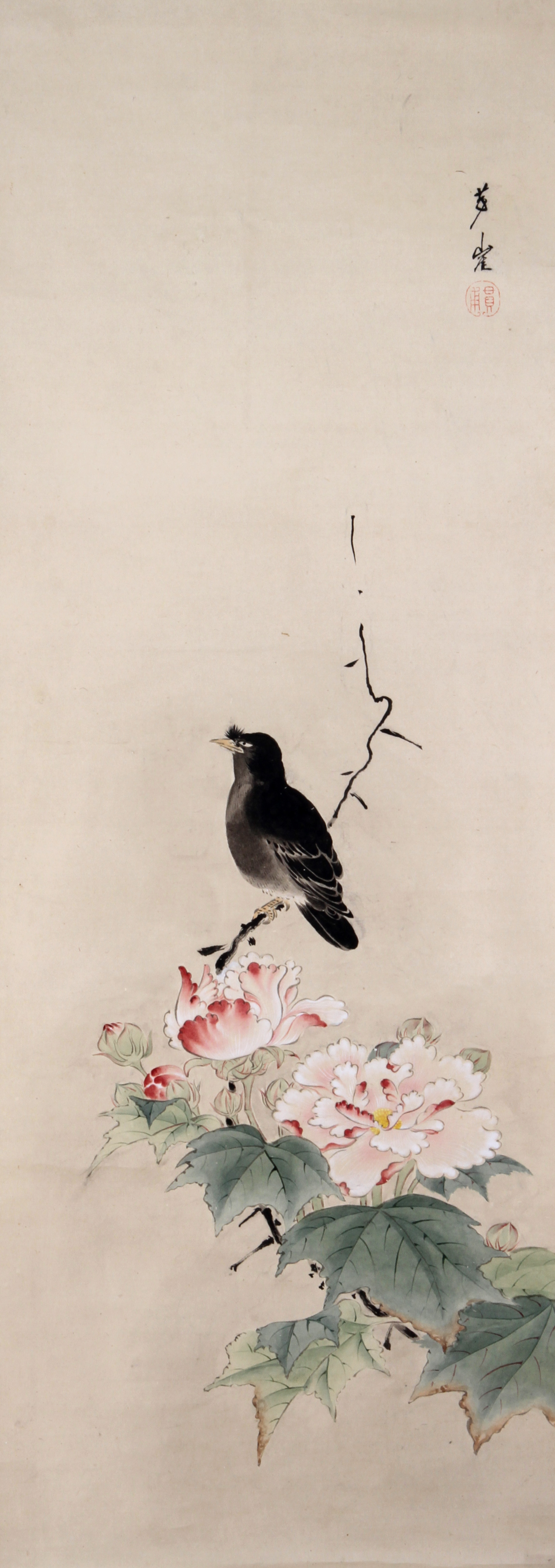 文政11年(1828)山口県下関に生まれ、毛利藩お抱え絵師・狩野晴皐の子で木挽町狩野勝川院雅信に学んだ。橋本雅邦とは同日に入門し、生涯の盟友となっていく。代表作に「不動明王」や「悲母観音(重文)」などがある。叭々鳥とは、中国、東南アジアに生息する鳥で、めでたい事を表し、好んで描かれる画題である。 | 芙蓉叭々鳥[その他のファイル/1.2MB] |