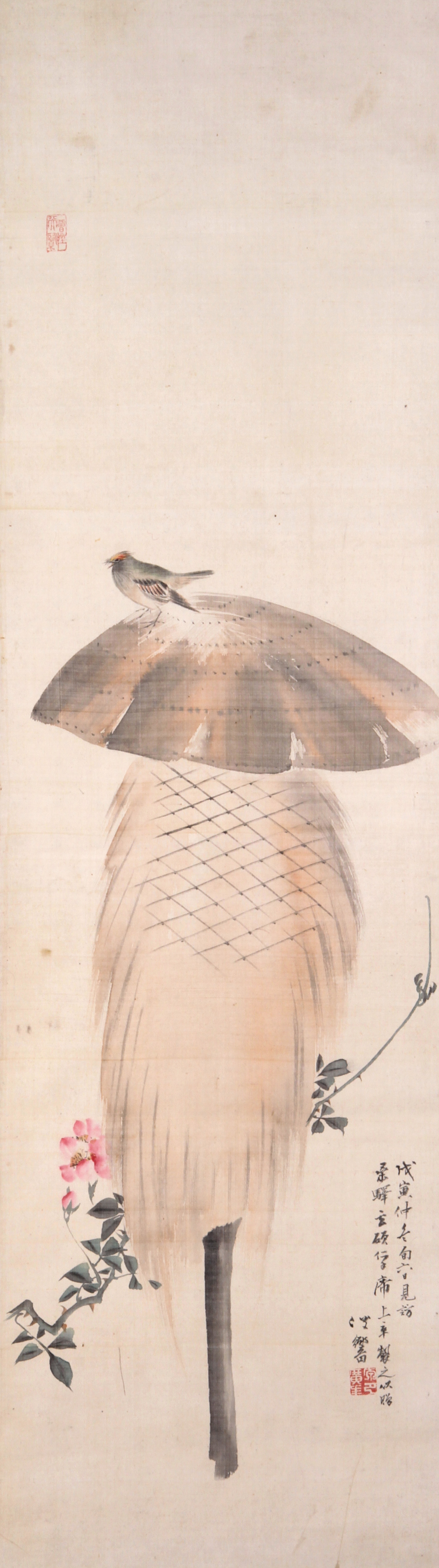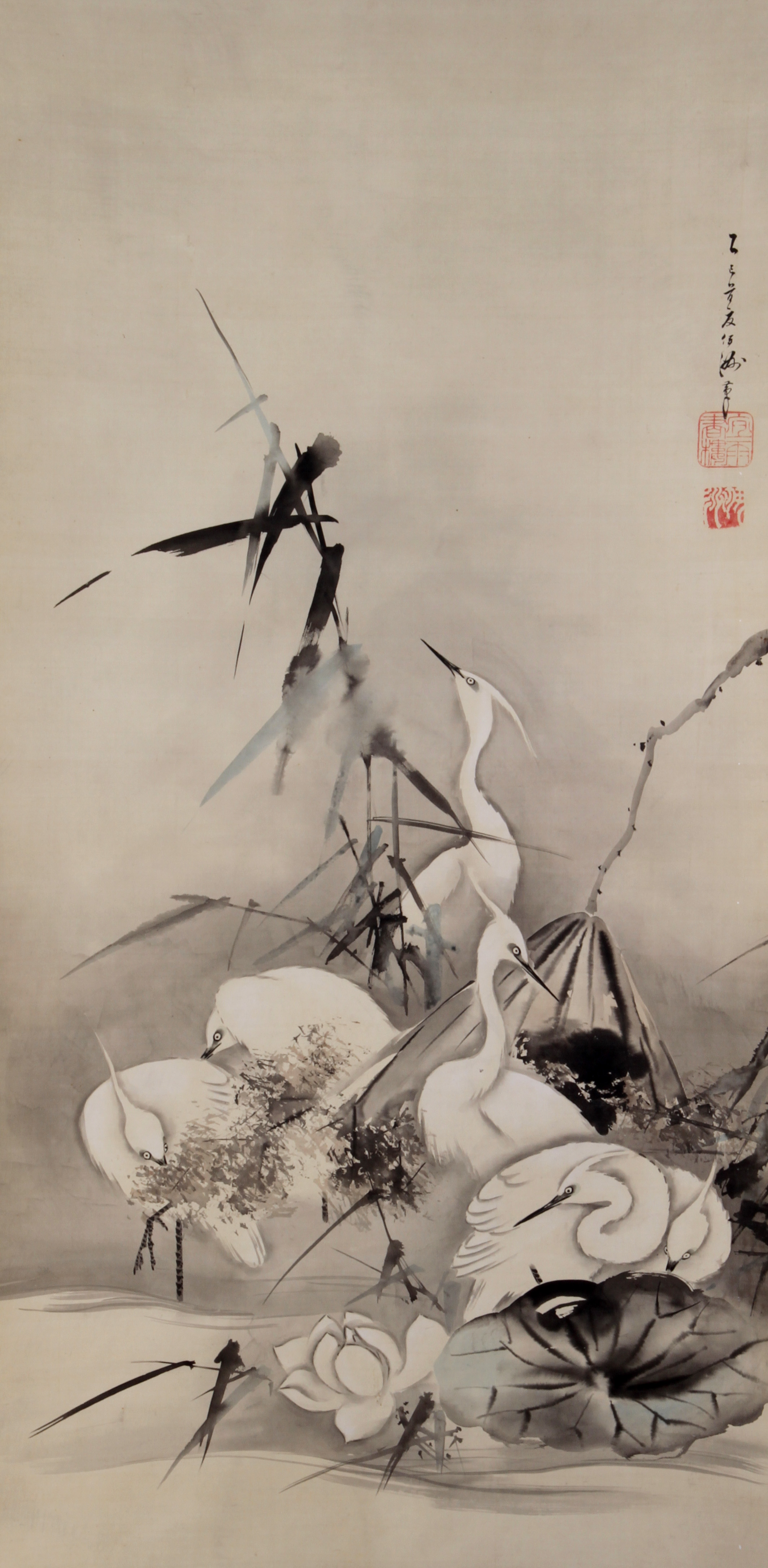 寛政3年(1791)仙台に生まれる。幼い頃から画才を発揮し、仙台藩の菊田家をついだ。藩絵師の後継者となった伊洲は、江戸に出ると木挽町狩野派8代目当主の狩野伊川に入門する。文人画家との交友も積極的で谷文晁とも親しくと交わった。のちに江戸城再建に伴う障壁画の制作に参加、また高野山諸寺院の障壁画も手掛けた。東東洋、小池曲江、菅井梅関らとともに仙台四大画家のひとり。62歳で歿する。 | 蓮に鷺[その他のファイル/1.4MB] |