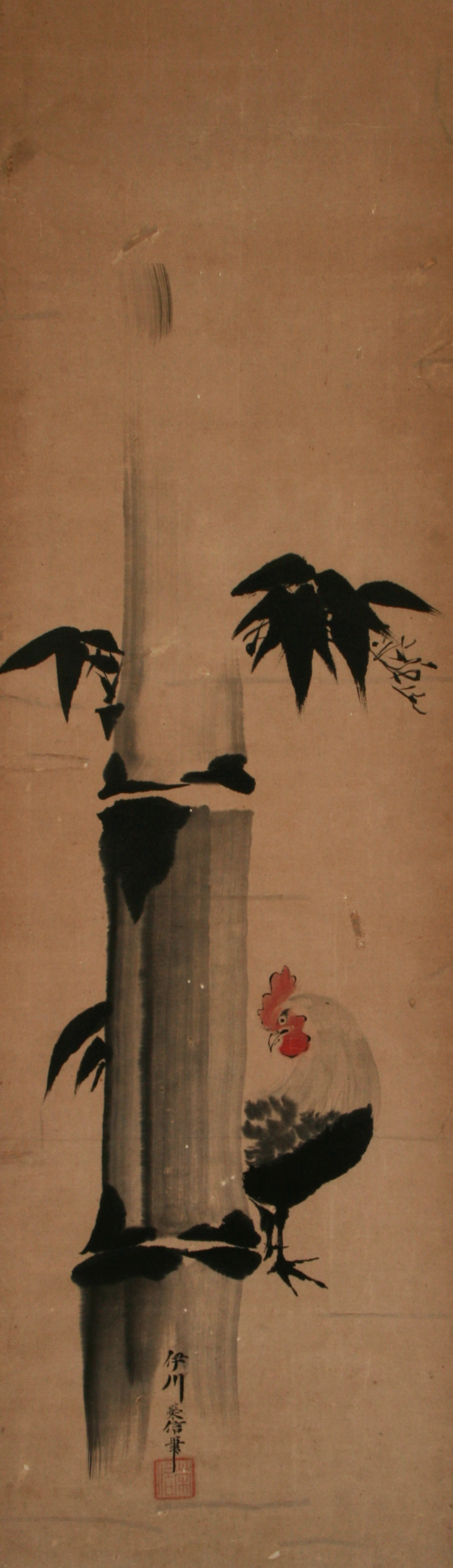 江戸後期の画家。江戸生まれ。奥絵師四家のひとつである木挽町狩野家の8代目。狩野養川院惟信の子。享和2年に法眼、文化13年に法印となる。54歳で歿した。作品では「草花群虫図」、「平家物語図」などが有名。 | 竹鶏[その他のファイル/650KB] |