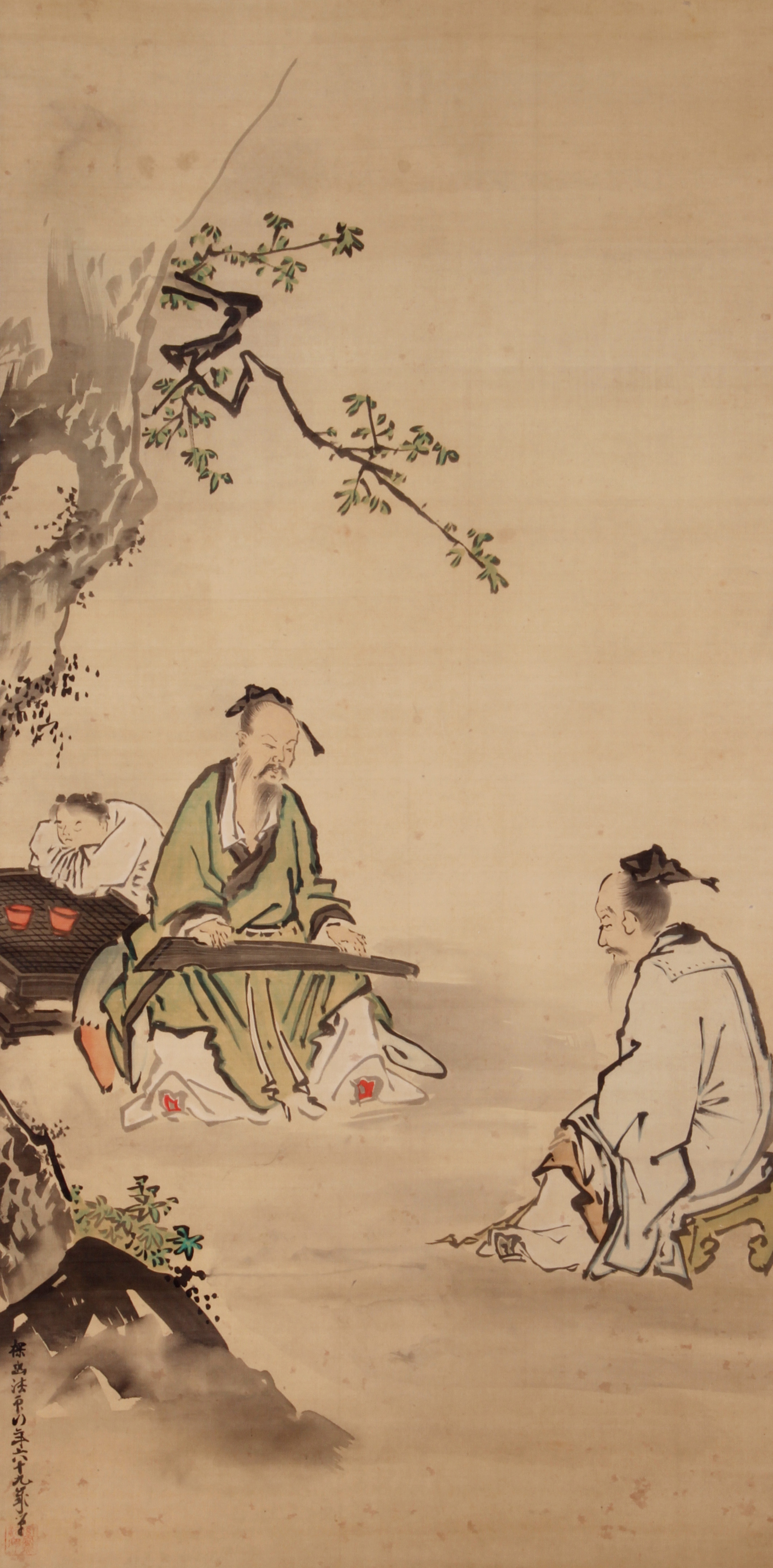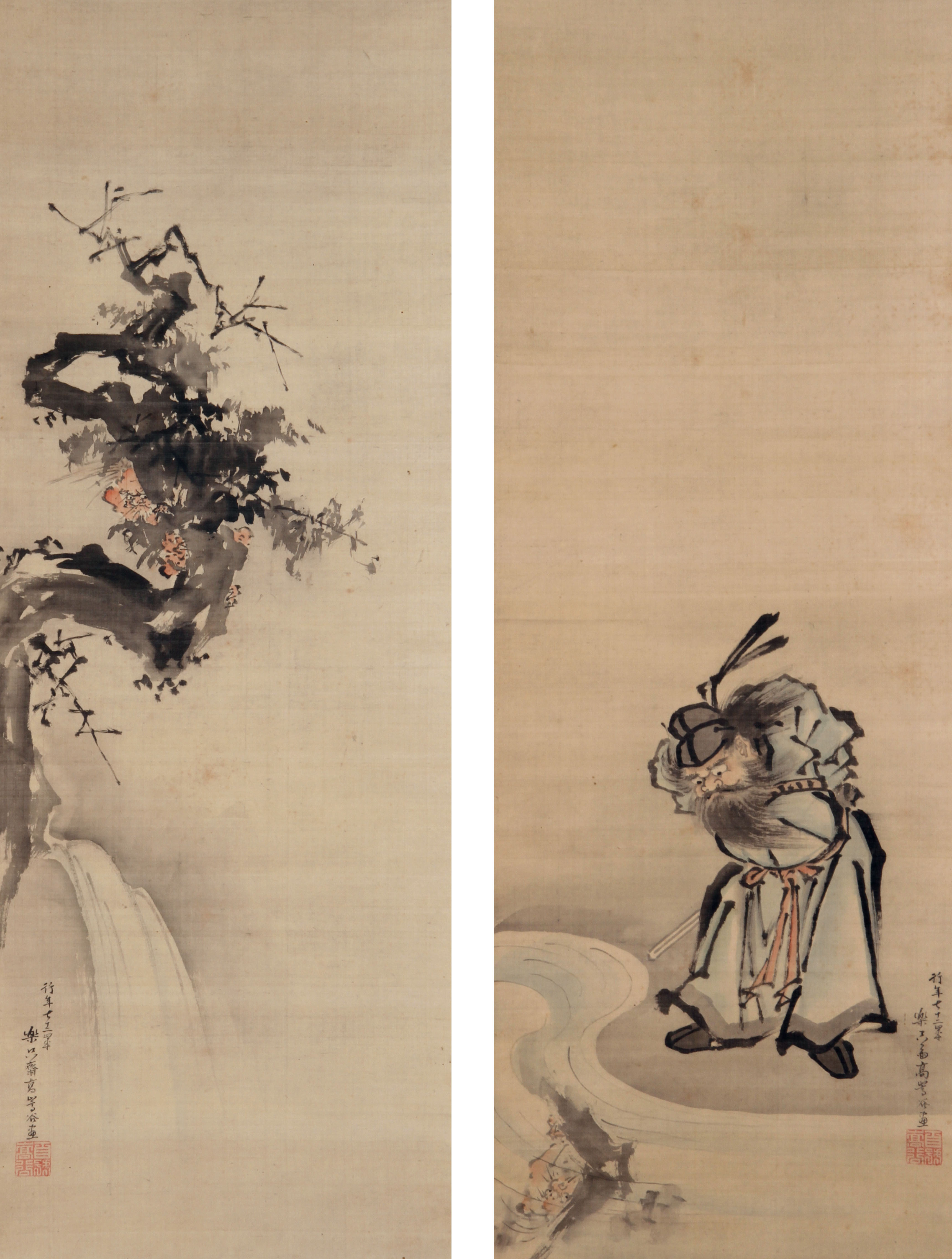 幕末明治の日本画家。江戸下谷徳川幕府与力の家に生まれる。18歳の時に狩野派の高田円乗に学ぶ。さらに土佐派や和・漢・洋の画法や有職故実を研究。歴史画を得意とした。代表作に「五百羅漢図」や「地獄変相の図」などがある。 | 大堰川管絃図[その他のファイル/1.6MB] ※大堰川は京都嵐山の麓を流れる桂川のこと。 |