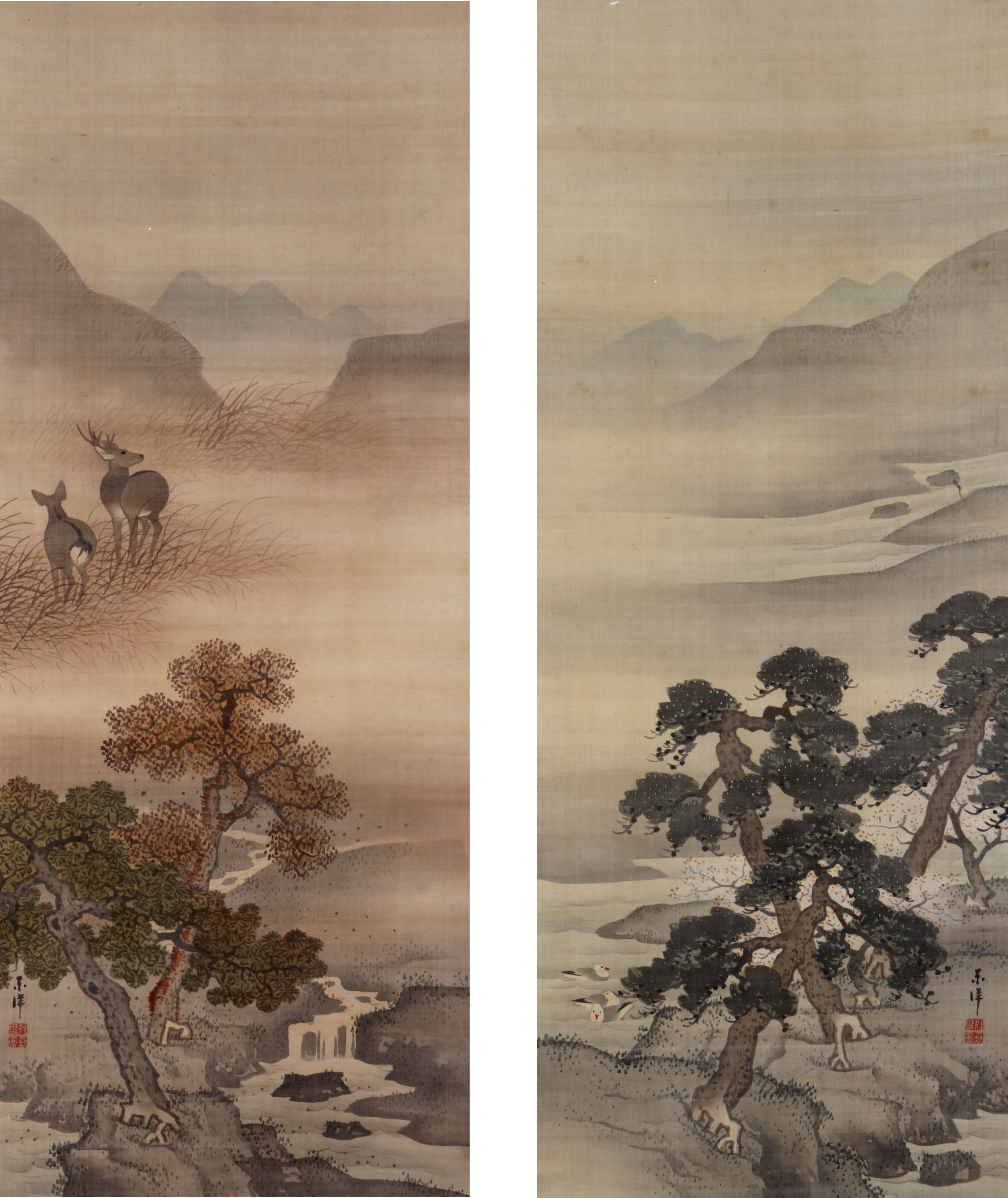 江戸中~後期の画家。陸奥栗原郡(現宮城県)出身。京都で狩野梅笑に狩野派を学び養子となる。のちに円山応挙、池大雅、松村呉春等に師事。画家として最高の位「法眼」に叙せられた。晩年は帰郷して仙台藩の画家として仕えた。85歳で歿する。 | 春秋山水[その他のファイル/1.5MB] |