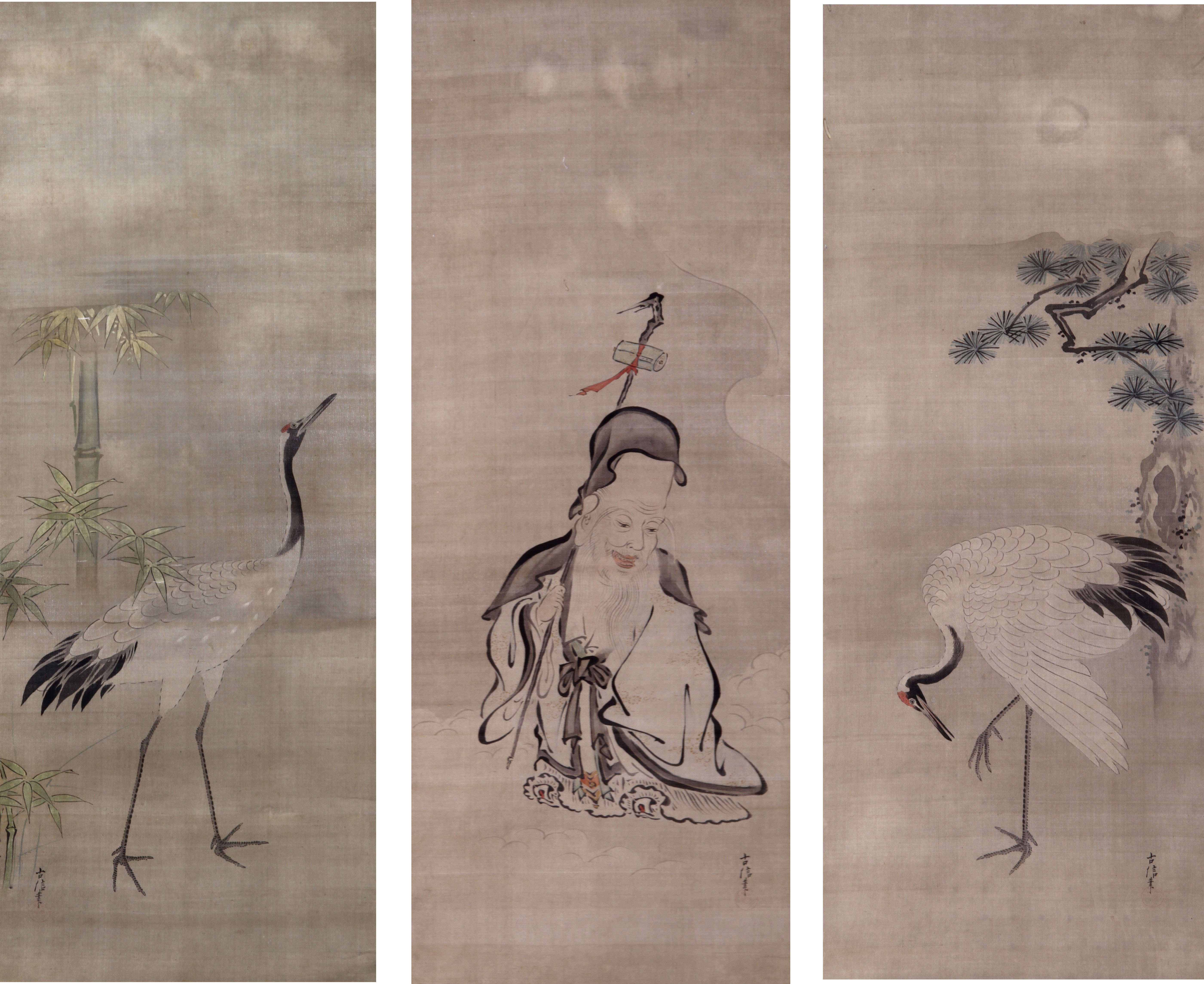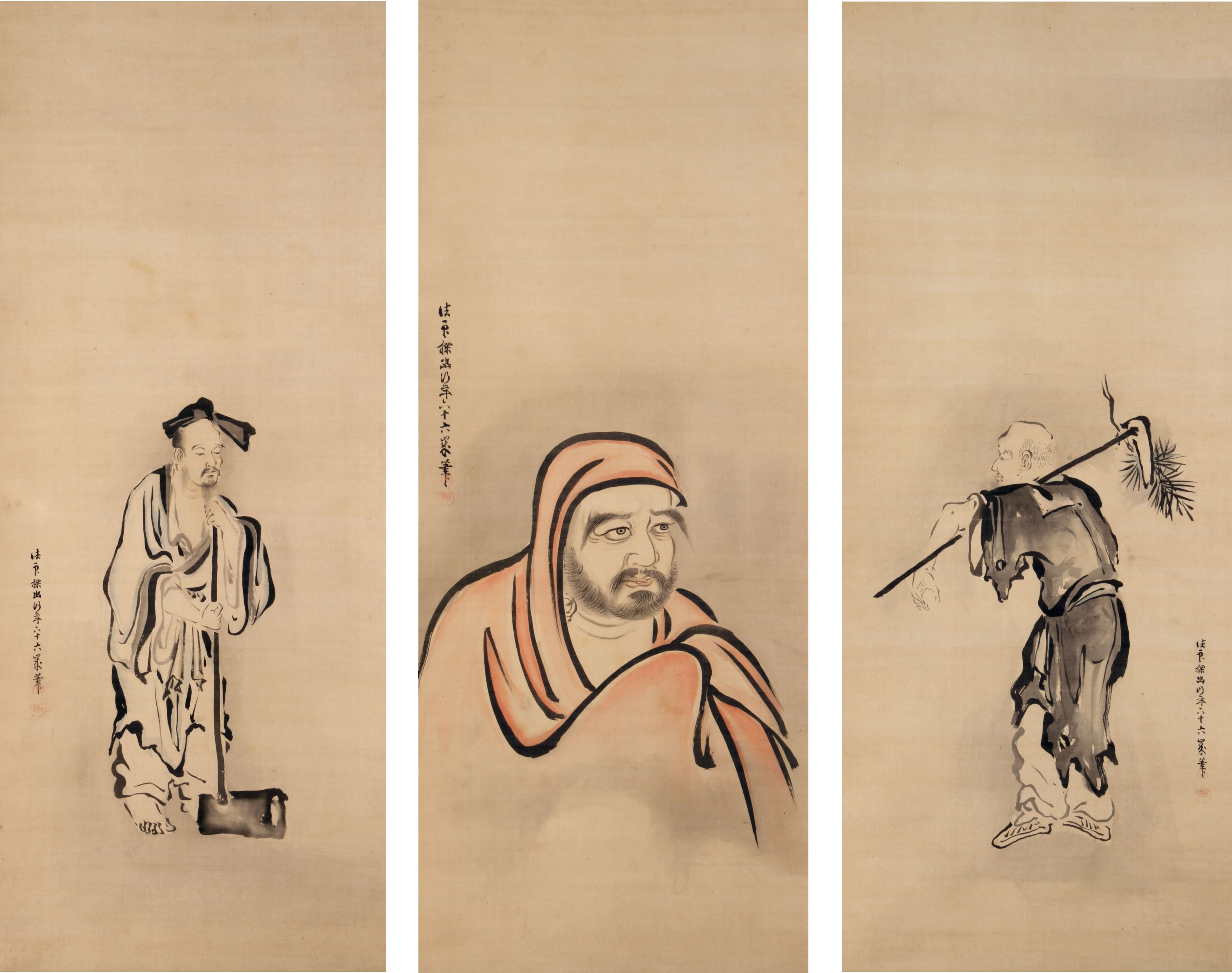 | 狩野探幽 | 同上 | 達磨五祖六祖[その他のファイル/1.8MB] ※達磨は中国の禅宗の開祖といわれ、禅の中心であり、中幅に描かれている。右幅の五祖とは「弘忍(こうにん)」、左幅の六祖とは「慧能(えのう)」のこと。それぞれ禅宗の五番目、六番目の祖である。 |