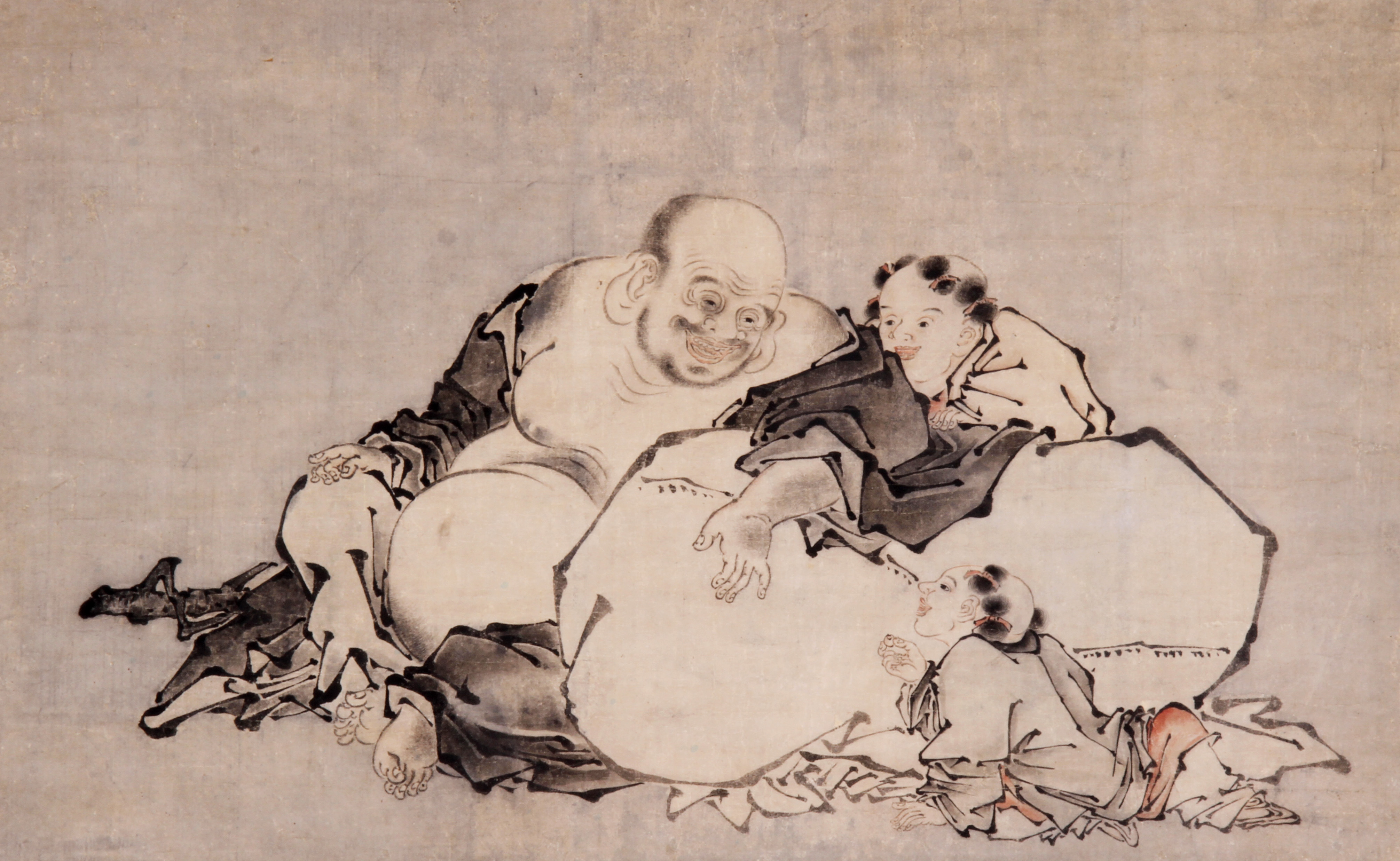 文明8年(1476)京都生まれ。狩野派の始祖・狩野正信の長男。幼い頃より画才を発揮し、画ははじめ父に学ぶ。のちに土佐派や周文雪舟を研究。土佐光信・雪舟と共に本朝三傑と称される。また晩年、越前守に任じられ、のちに法眼に叙せられた。代表作には「大仙院の襖絵」や「鞍馬寺縁起絵巻」などがある。84歳で歿する。 | 布袋唐子[その他のファイル/1.7MB] |