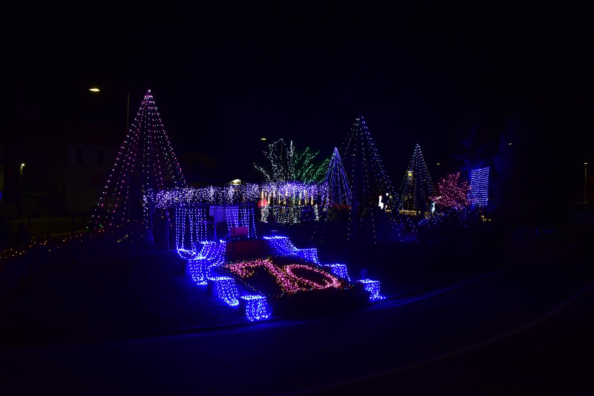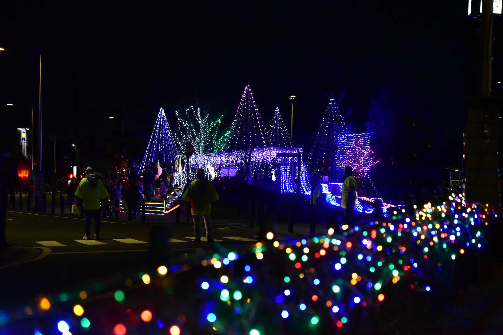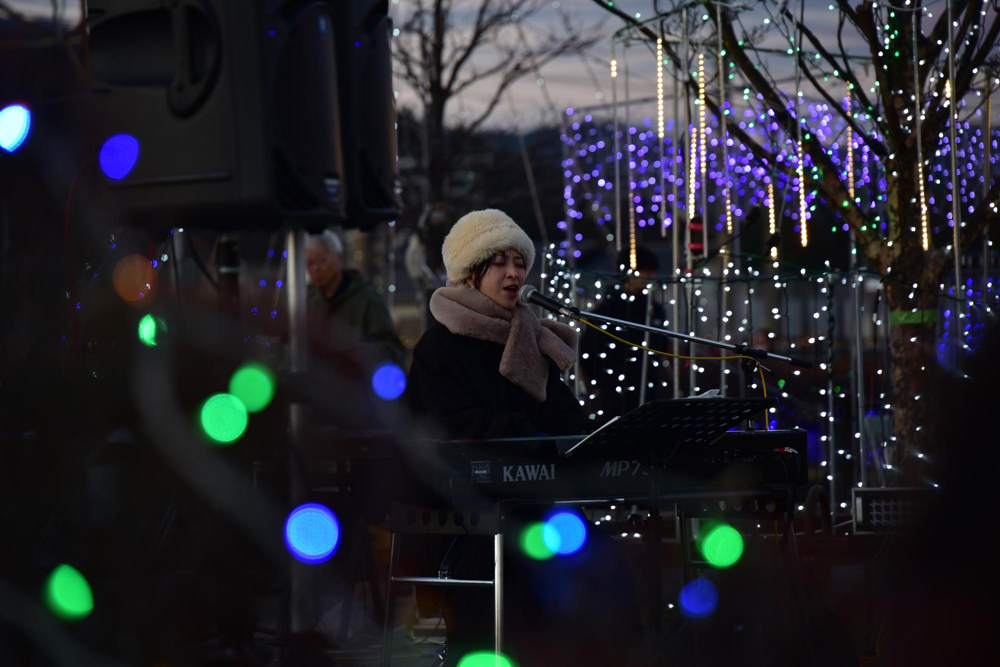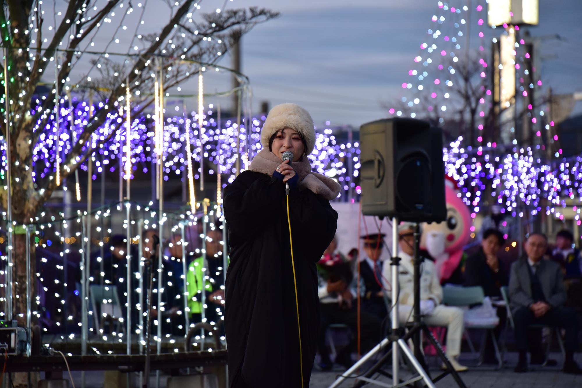 12月20日土曜日、JR桑折駅前ロータリーにおいて、町制施行70周年記念事業のフィナーレとなる「桑折駅前イルミネーション」の点灯式が行われました。澄み切った冬空の下、記念すべき年への感謝と輝く未来を祈念しながら、佐藤克巳会長や町長らにより点灯スイッチが押されると、約3万球の光が一斉に灯り、約800人による来場者から大きな拍手と歓声が送られました。点灯式終了後には、特別ゲストのkainatsuさんによるミニライブが開催され、来場者は、幻想的な景色に優しく溶け込む歌声に耳を傾け、心温まるひと時を過ごしました。